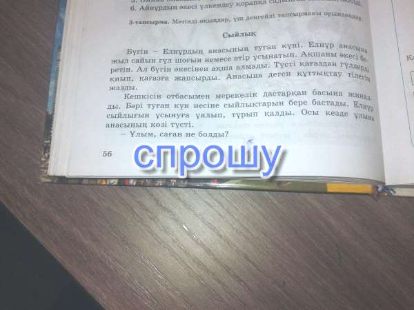 Сегодня день рождения у мамы Елнура..Каждый год Елнур дарил маме букет цветов или духи.Деньги давал папа.А сегодня деньги у папы он не взял. Из цветной бумаги он вырезал цветы и приклеил на бумагу.Написал поздравительные пожелания маме.Вечером . всей семьей собрались за праздничным столом.Все начали дарить подарки имениннице .Елнур застеснялся дарить свой подарок.В это время взгляд мамы упал на сына.