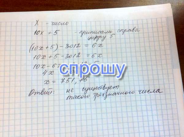 Требуется найти трехзначное число, удовлетворяющее следующему условию: если к нему приписать справа цифру 5 и из полученного четырехзначного числа вычесть 3012, то разность будет в 6 раз больше трехзначного числа.Чему равно это число?