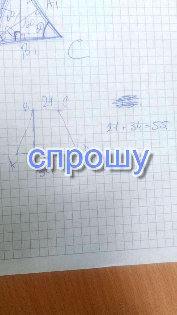 Из вершины тупого угла равнобедренной трапеции опустили высоту ,длины которых равны 21 и 34 м. Найдите сумму длин оснований трапеции.