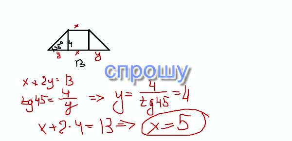 Найди меньшее основание равнобедренной трапеции, если ее высота равна 4 см, угол при основании 45 градусов, а большее основание 13 см.