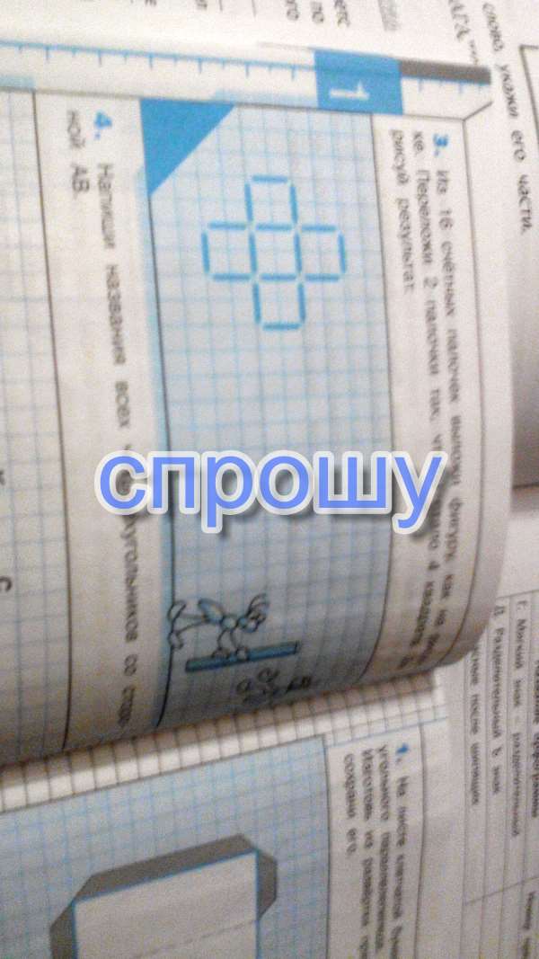 Из 16 счётныз палочек выложили фигуру, как на рисунке. Переложи 2 палочки так, чтобы стало 4 квадрата. Зарисуй результат.