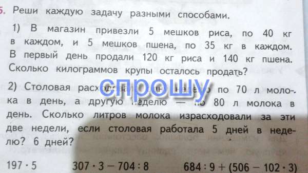 №1 1) (5*40)-120=80 2) (5*35)-140=35 3) 80+35=115 Ответ:115 кг № 2 1) (70+80)*(5*2)=150*10=1500 2) (70+80)*(6*2)=150*12=1800 Ответ: 1500, 1800