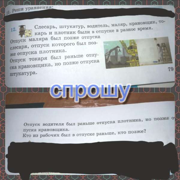 Токарь, штукатур, крановщик, водитель, плотник, слесарь, маляр. В таком порядке люди уходили в отпуск, следовательно, токарь раньше, маляр позже