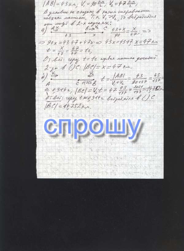 Из двух городов A и B, расстояние между которыми равно 43 км, одновременно выехали две автомашины. Скорость первой машины равна 90 км/ч, а скорость второй машины 47 км/ч. На каком расстоянии от города B обе машины встретятся и через какое время?