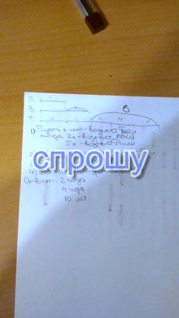 пете два года, значит васе 2 * 2 = 4, а толе 4 + 6 = 10, или 2 * 5 = 10
