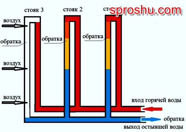 Если в одном из стояков (стояк 3) создалась воздушная пробка, то циркуляция воды в батареях этого стояка прекращается и в квартирах становится холодно (а у соседей - тепло!).