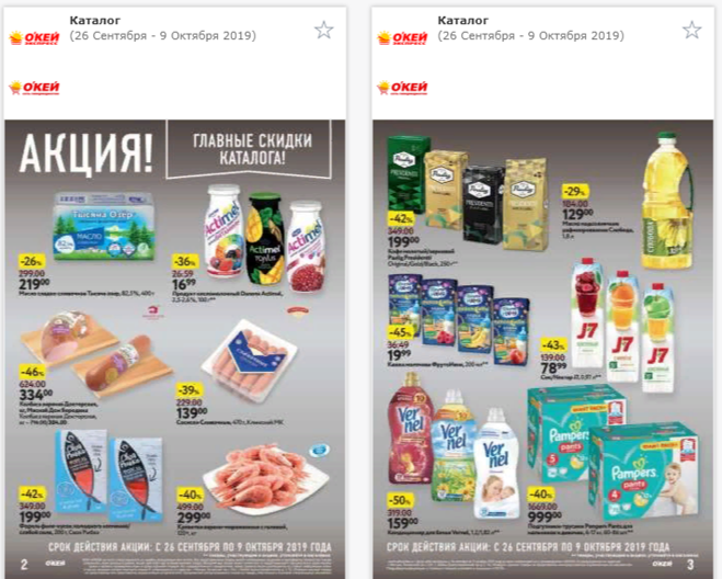 Акции в сети в сети гипермаркетов под названием "Окей" начнутся с 26 сентября 2019 года. В обновлённом каталоге огромный выбор товаров с приятными для покупателя скидками и сниженными ценами на продовольственные и хозяйственные товары.