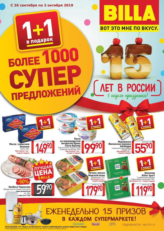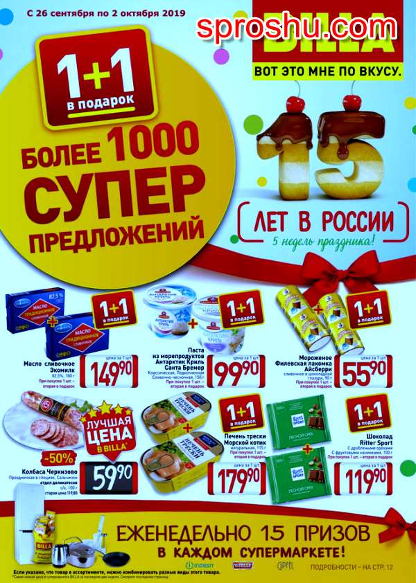 С 26 сентября 2019 года в сети популярных супермаркетов под названием "Билла" начинается новая недельная акция с замечательными скидочками на продовольственные и хозяйственные товары. В каталоге огромный выбор товаров со скидками.