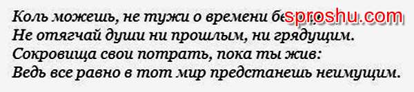 А не эта ли самая мысль о смерти вдруг заставила человека задуматься о смысле жизни? Да, сперва эта мысль кажется нам ужасающей, угнетающей, мешающей жить нашу детскую беззаботную жизнь. Но именно эта мысль становится повитухой для рождения нас в осмысленную жизнь человека. Мысль о смерти безжалостно лишает смысла такую жизнь, которая проходит под девизом: "бери от жизни всё". Просто потому, что всё, что ты от жизни возьмешь, ты никуда не унесешь и не сохранишь.