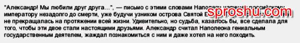 Казалось бы, удивительный факт, русский император дарит Наполеону коня, на котором тот потом въезжает в Москву, но ничего удивительного в этом нет, все же мы знаем, насколько Александр I любил Наполеона и восхищался им. Отношения этих двоих продолжались всю жизнь, они всю жизнь переписывались. Наполеон написал в конце своей жизни (негодяи часто бывают сентиментальны) письмо Александру: