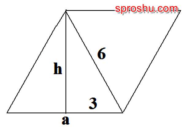 h=кор.кв[a в кв.-(a/2)в кв.]=кор.кв[6 в кв.-3 в кв.]=кор. кв (36-9)=кор. кв 27=5,2 (приблизительно)