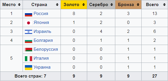 В медальном зачете: Россия - первое место, Япония - второе место, Израиль - третье место.