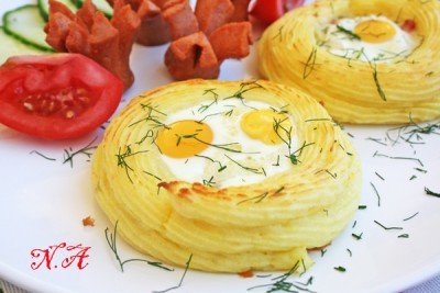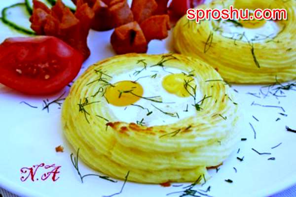 - в духовке или на сковороде сделать блюдо на ужин для всей семьи "яйца в картофельном гнезде", присыпав зеленью и тертым сыром: