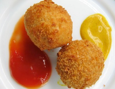 ой фарш, маринованные грибы и т.д. и т.п.).Сформировать шарики из картофельного пюре,обвалять в панировочных сухарях, обжарить во фритюре.