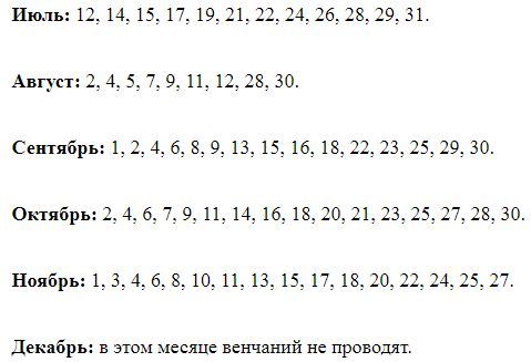 Когда Рождество Богородицы? Оно всегда бывает в одну и ту же дату - 21 сентября. В этом году это суббота. Как показано в календаре, в этот день нельзя проводить таинство венчания, поскольку это праздник, причем не простой, а так называемый двунадесятый (их всего 12 в году - 2 и 10 в слове складываются). Верующие просто таки обязаны храм посетить в этот день, где пройдет служба. Но, вообще-то в такие праздники запрета на венчание нет, просто нежелательно. А почему тогда нельзя 21 сентября 2019 года венчаться? Все просто - в субботу на это существует запрет. Вот еще список венчальных запретов: