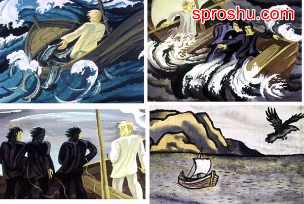 А вот и картинки, рисунки к сказке. На верхней слева Маттиас попадает в бурю, он вынужден выбросить всю рыбу за борт. На верхней справа - это уже он с братьями-воронами в бурю попадает. На нижней слева они рыбачат, братья дают Маттиасу удачливую сеть. А на нижней справа - спустя год Маттиас снова приплывает на Ут Рест.
