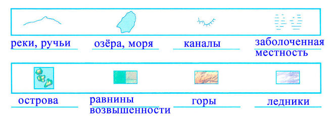 Условные знаки географической карты - это символическое изображение природных и антропогенных (созданных человеком) объектов на карте. В задании 2 требовалось подписать условные обозначения: верхняя строка идем слева направо - реки, озера (или водохранилища), искусственного канала, заболоченной местности;