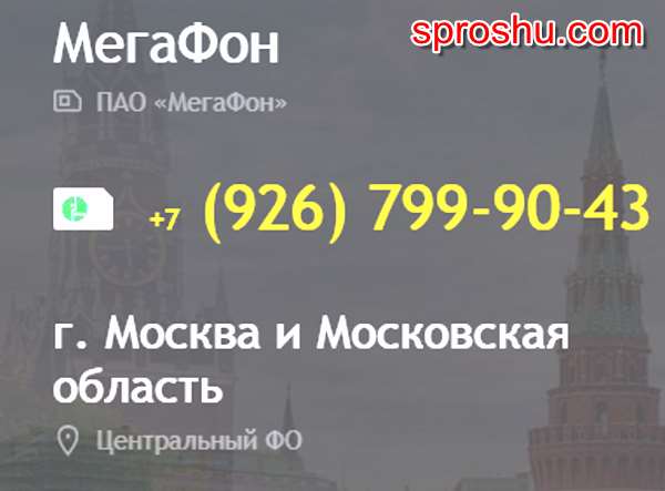 Этот телефонный номер +79267999043 (89267999043) принадлежит оператору ПАО "МегаФон" в регионе г. Москва и Московская область.