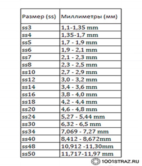Конечно существует таблица размеров страз. В соответствии с этой таблицей ss24 равняется 5,27- 5,44 mm