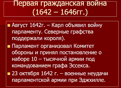 август 1642 г.//начало гражданской войны//первое вооруженое столкновение между членами парламента и роялистами.