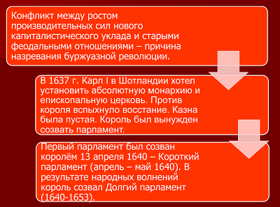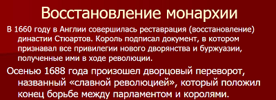 Вывод: конечным результатом революции стала дискредитация идеи божественного права короля, увеличение роли парламента, особенно в политических вопросах. Отныне действия английского монарха будут ограничены конституционным соглашением.