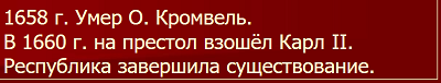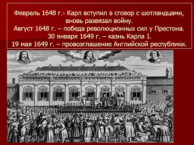 1649 г.//окончание войны, победа парламента, казнь Карла I//провозглашение республики, отмена королевской власти.