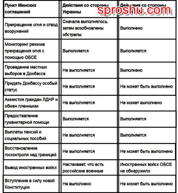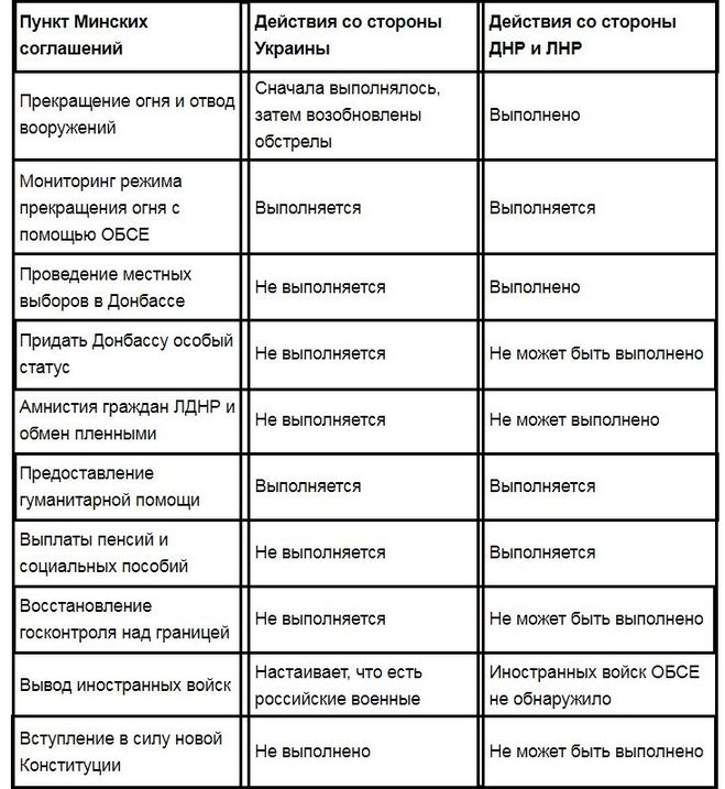 В представленной таблице изложены пункты соглашений "Минск-2", подписанных гарантами: ОБСЕ, Германия, Франция, Россия, а также Украиной, ЛНР, ДНР.
