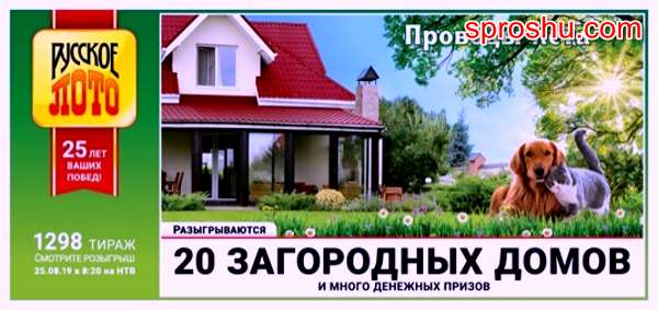 Двадцать пятого в воскресное утро на телеканале "НТВ" прошел очередной тираж всеми любимого тиража "Русского лото" под номером 1298 и красивым названием "Проводы лета", которое мы так в этом году и не увидели - истинно русская забава. Игрокам было обещано двадцать домов дачных и как всегда множество денежных призов. И джек - пот, вновь не разыгранный который приближается уже к рекордной отметке за миллиард "деревянных"... Кому не повезло - повезет в следующий раз как и мне же.