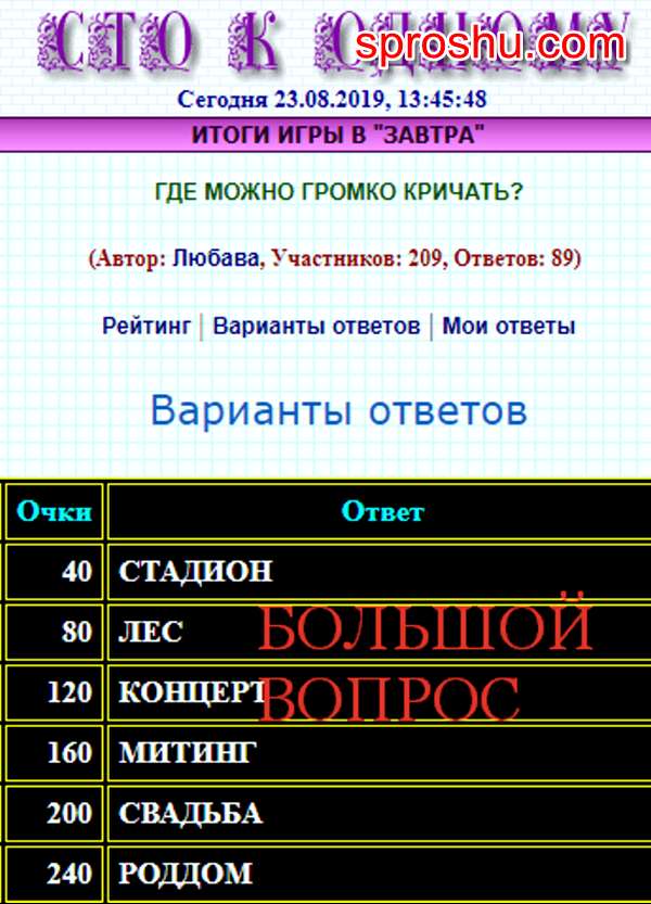 На первой строчке находится Стадион. Ответ позволяет игрокам заработать 40 баллов,