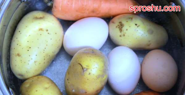 Сначала мою и отвариваю 6-7 картошин средней величины в мундире, одну морковку и 5-6 куриных яичек. Чтоб картошка и морковка не разварились и потом были упругими и не разваливались, в воду засыпаю полный стакан йодированной соли.