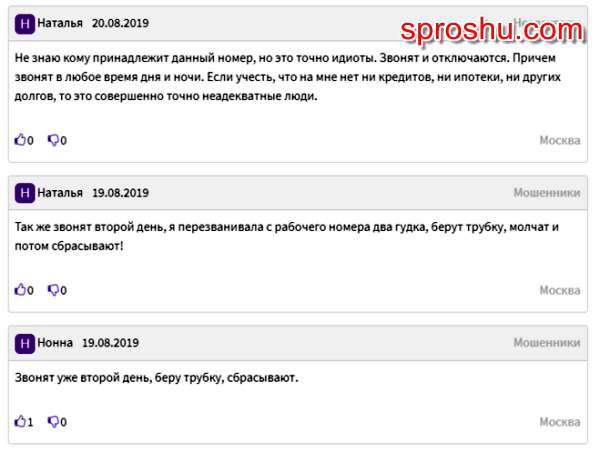 В интернете очень большое количество отзывов об этом номере телефона, и все отзывы практически единогласно говорят о том, что с этого номера телефона делаются короткие немые звонки, то есть звонок и сразу же сброс звонка. Так делают рекламные компании которые рекламируют разные услуги, товары, и всё что угодно могут рекламировать, делают они так для того чтобы вы перезвонили и когда вы перезвоните вы будете слушать автоответчик, который вам будет зачитывать различные рекламные сообщения. И звонок на этот номер телефона будет платный поэтому перезванивать на него не стоит. А чтобы он вас больше никогда не беспокоил, лучше всего занести его в чёрный список у себя в телефоне, с пометкой как рекламный спам