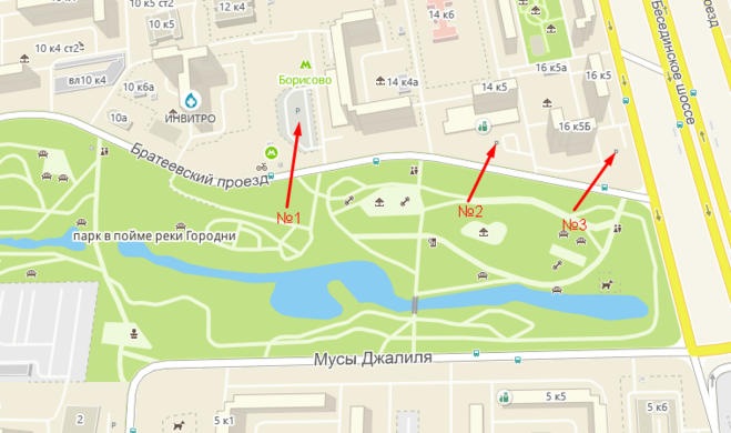 - №1. Парковка у станции метро Борисово. Стоит 50р в час за первые 2 часа, далее бесплатно до конца текущих суток. Вместимость 74 автомобиля.