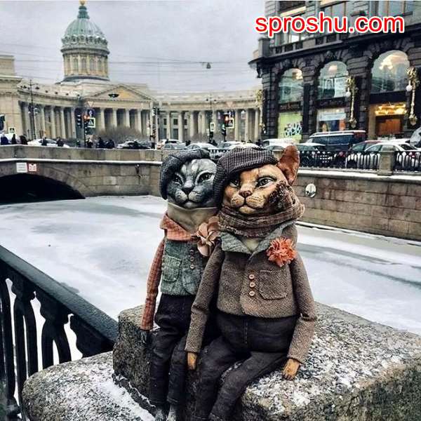 Елена создает своих кукол из пластика по технике папье-маше и набивает тканью . Фотографирует их на фоне Казанского собора, Петропавловской крепости и в других живописных местах.