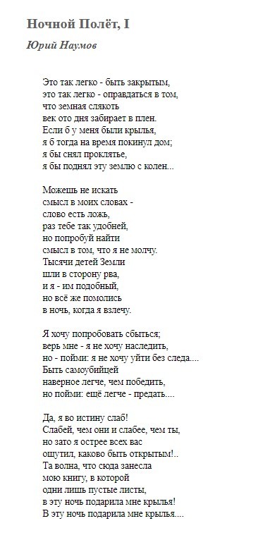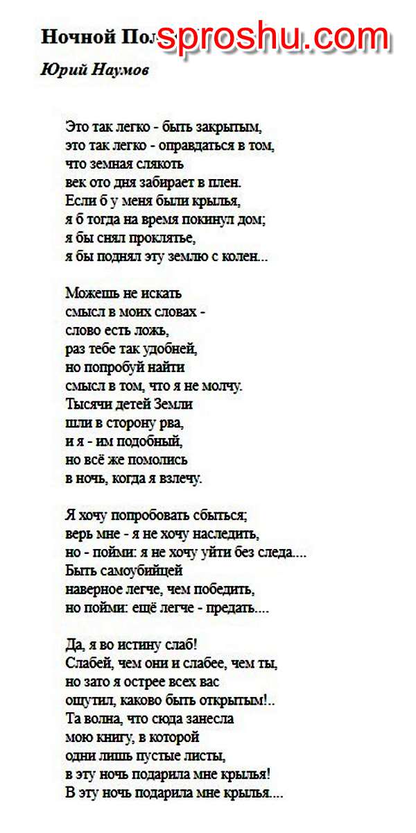 Рядом с этой песней и творчество Юрия Наумова. Для многих его голос неприятен, но мне всё равно. Глубина его тектов компенсирует всё остальное. В чём-то близкий по духу человек. Как пример его творчества песня "Сказка о Карле" и "ночной полёт"