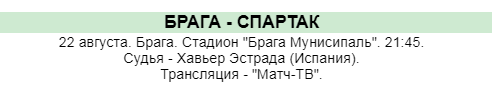 Сам матч "Брага - Спартак" стартует на стадионе "Брана Мунисипаль", стартовый свисток испанца Хавьера Эстрады прозвучит в 21:45 мск, в прямой трансляции покажет телеканал "Матч ТВ".
