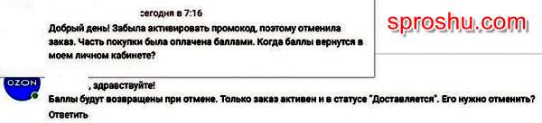 Иногда на заказ тратится немалое количество баллов. А так как один балл - это 1 рубль, то терять такую скидку явно не хочется. Сейчас сам Озон очень часто отменяет заказы, но бывает, что заказ отменяет или просто не получает сам покупатель. Вернутся ли в таком случае потраченные баллы на счет? Сотрудники магазина на подобные вопросы со стороны покупателей отвечают так: