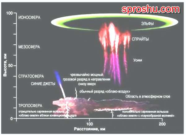Эти электрические разряды наблюдаются над мощными грозами. Те разряды, которые повыше - это эльфы (жёлто-зелёный круг) и спрайты (красные излучения сложной формы). Те электрические разряды, которые пониже (в мезосфере) называются джеты (синий луч). Я изредка могу видеть около гроз слабое сияние в ночном небе. Как выглядят эти электрические разряды, подробно показано на фото ниже.