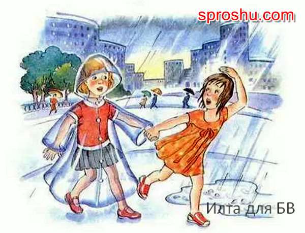 Тут две девочки подружки бегут от дождя, только Маша в плаще, а Таня нет, поэтому она в итоге вымокла. Нарисуем сначала Машу. Она в красном плащике, в резиновых сапожках, колготках. Дорисуем девочке волосы, черты лица. Обязательно надо ее нарисовать бегущую. Рядом нарисуем бегущую Таню, но уже в другой одежде и с короткими волосами. Надо чтобы девочки отличались. Вокруг нарисуем капли дождя, под ногами подружек лужи, а на небе серые грозовые тучи. Можно еще добавить зеленого фона, это будет участками трава.