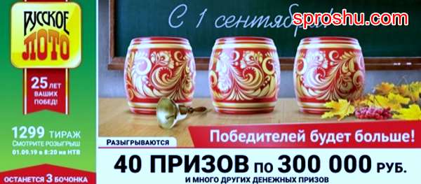 Русское лото проведет розыгрыш первого сентября 2019 года. По счету это будет тираж под номером 1299.
