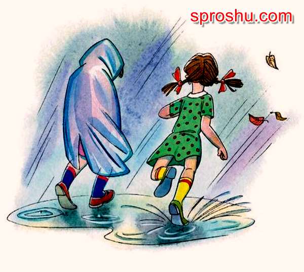 Рассказ Валентины Осеевой «До первого дождя» о двух девочках-подружках Маше и Тане. Они вместе ходили в детский сад и однажды по дороге попали под дождь, Таня была в одном платье, а Маша в плаще и она не промокла под дождем, а Таня пришла в детский сад вся мокрая. Подружка могла бы поделиться плащем и накрыть им Таню, но сама побоялась промокнуть.