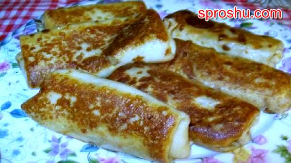 На блинчик положить начинку, завернуть конвертом и обжарить на слив.масле с обеих сторон. Подавать к чаю, можно полить фруктовым сиропом или вареньем.
