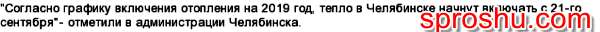 Начало отопительного сезона 2019-2020 гг. в Челябинске обозначено датой двадцать первое сентября. Именно в этот день стартует отопительный сезон, начнут подключать объекты социальной сферы города к теплу. Постепенно подключать будут жилой сектор к теплу, дадут отопление и в здания производственного назначения.