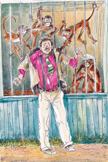 А в это время подружка нашей обезьянки схватила посетителя за пиджак, что заставило мужчину занервничать еще больше. Он громко стал звать сторожа, а в это время третья обезьяна стала хватать его за нос и за волосы. Посетитель принялся визжать от страха, но тут подоспел сторож.