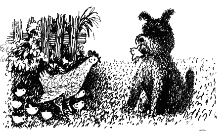 Вдруг к цыплятам подбежала собака и ухватила одного из них, другие же успели скрыться. Сначала кура тоже пустилась наутек, но тут же опомнилась и побежала к собаке.