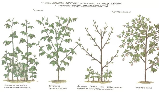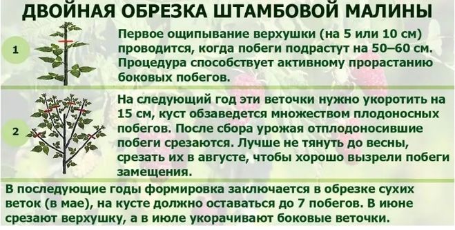 Агротехника ухаживания за штамбовой малиной мало чем отличается от ухода за обыкновенной. Малина положительно относится к влаге в почве. Для ее сохранения требуется мульчировать почву. Так как малина длительное время произрастает на одном и том же месте, осенью требуется вносить в почву удобрения. Лично я использую золу. Главное отличие заключается в обрезке кустов малины. Если обыкновенную малину мы обрезаем один раз осенью. То штамбовая требует двойную обрезку. Придется потрудиться. Зато малина отблагодарит вас хорошим качественным урожаем. Ниже для наглядности привожу схемы обрезки. Надеюсь, разобраться в них вам не составит особого труда.