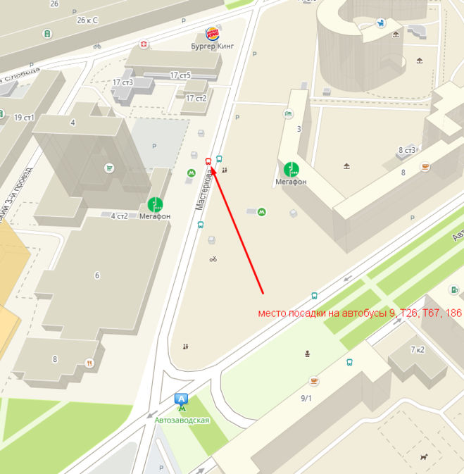 - автобусами №9, Т26, Т67, 186 до остановки "Парк Легенд". Место посадки на автобусы находится возле обувного центра на Автозаводской. Выход из метро последний вагон из центра, налево по переходу и и подняться направо по лестнице. Остановка "Метро Автозаводская" на четной стороне улицы Мастеркова: