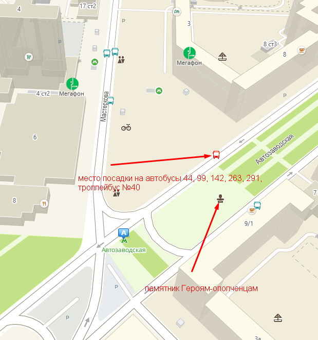 - автобусами №44, 99, 142, 291, 263, троллейбусом №40 также до остановки "Парк Легенд". Место посадки на эти маршруты: последний вагон из центра, направо по подземному переходу. Остановка "Метро Автозаводская" находится на чётной стороне Автозоводской улицы возле памятника ополченцам.