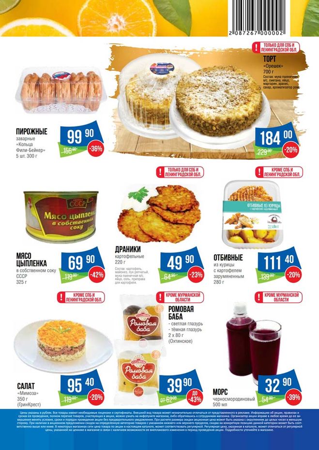 На мясо цыплёнка в собственном соку скидка - 42 процента. На заварные пирожные "Кольца Фили-Бейкер" - скидка 36 процентов.