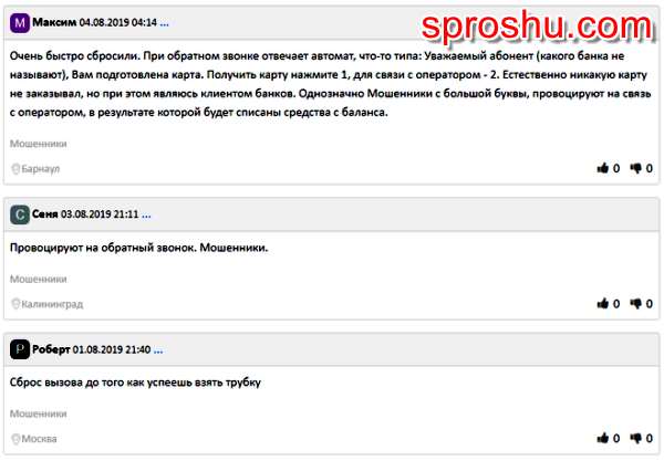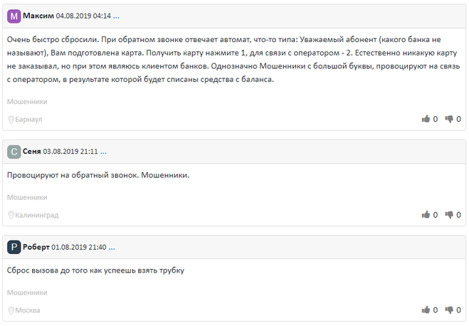 Отзывы о звонках с номера стали появляться в двадцатых числах июля 2019 года и все они негативны. География звонков - самая разнообразная и затрагивает разные города России. Сами звонки можно охарактеризовать, как провокативный немой звонок, а когда абонент перезванивает (представьте, скажем, из Барнаула в Москву - это наверное не дёшево), то автомат ему рассказывает про одобренную кредитную карту, при том, что пользователь её не заказывал нигде.