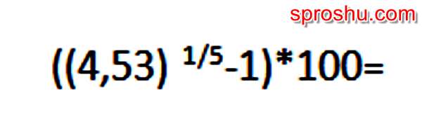 Значение данного выражения можно достаточно точно вычислить без калькулятора. 4,53^(1/5)=(√ пятой степени из 4,53)^1. корень пятой степени из 4,53 найдём приблизительно методом последовательных приближений. Примем для начала что это 1,2, тогда 1.2*1,2*1,2*1,2*1,2=2,48832, что меньше 4,35. принимаем за корень 1,25, тогда 1,25*1,25*1,25*1,25*125=3,0,51..., что тоже меньше 4,35. принимаем за корень 1,5 тогда 1,5*1,5*1,5*1,5*1,5=7,59... что больше 4,35. принимаем за корень 1,3, тогда 1,3*1,3*1,3*1,3*1,3*1,3=3,7... , что меньше 4,35. принимаем за корень 1,4, тогда 1,4*1,4*1,4*1,4*1,4=5,378... что больше 4,35. принимаем за корень 1,35, тогда 1,35*1,35*1,35*1,35*1,35=4,484... что немного больше 4,35. Принимаем за корень 1,34, тогда 1,34 *1,34*1,34*1,34*1,34=4,32, что чуть меньше 4,35. Принимаем за корень 1,341, тогда 1,341*1341*1,341*1341*1,341=4,3365. принимаем за корень 1,342, тогда 1,342*1,342*1,342*1,342*1,342=4,3527... на этом можно остановиться. 1,342^1= 1,342. 1,342-1= 0,342. 0,342*100=34,2. Ответ; данное выражение при вычислении без калькулятора приближенно равно 34,2.